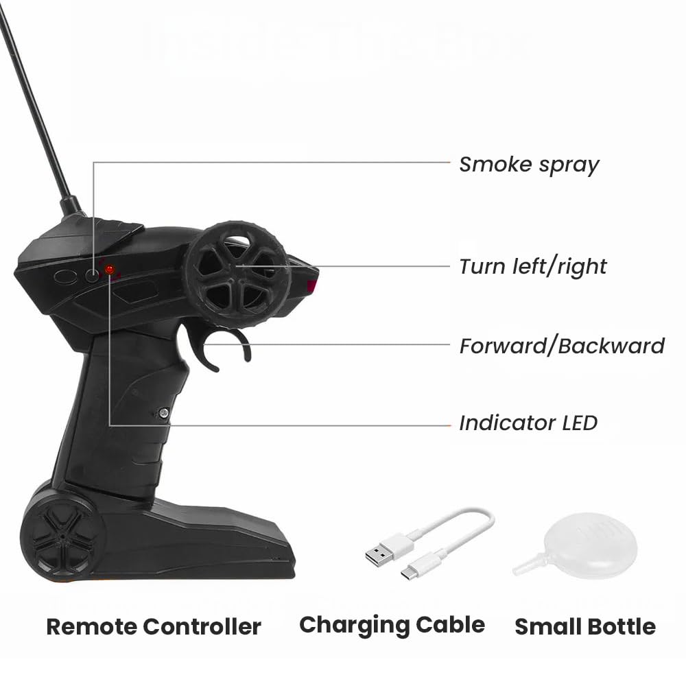 It also comes with a real smoke spray effect that makes playtime more fun and lifelike. Just add a little water and see the car release cool smoke as it races forward. The easy-to-use remote lets you move the car in every direction - forward, backward, left, and right and control the spray with a simple button.