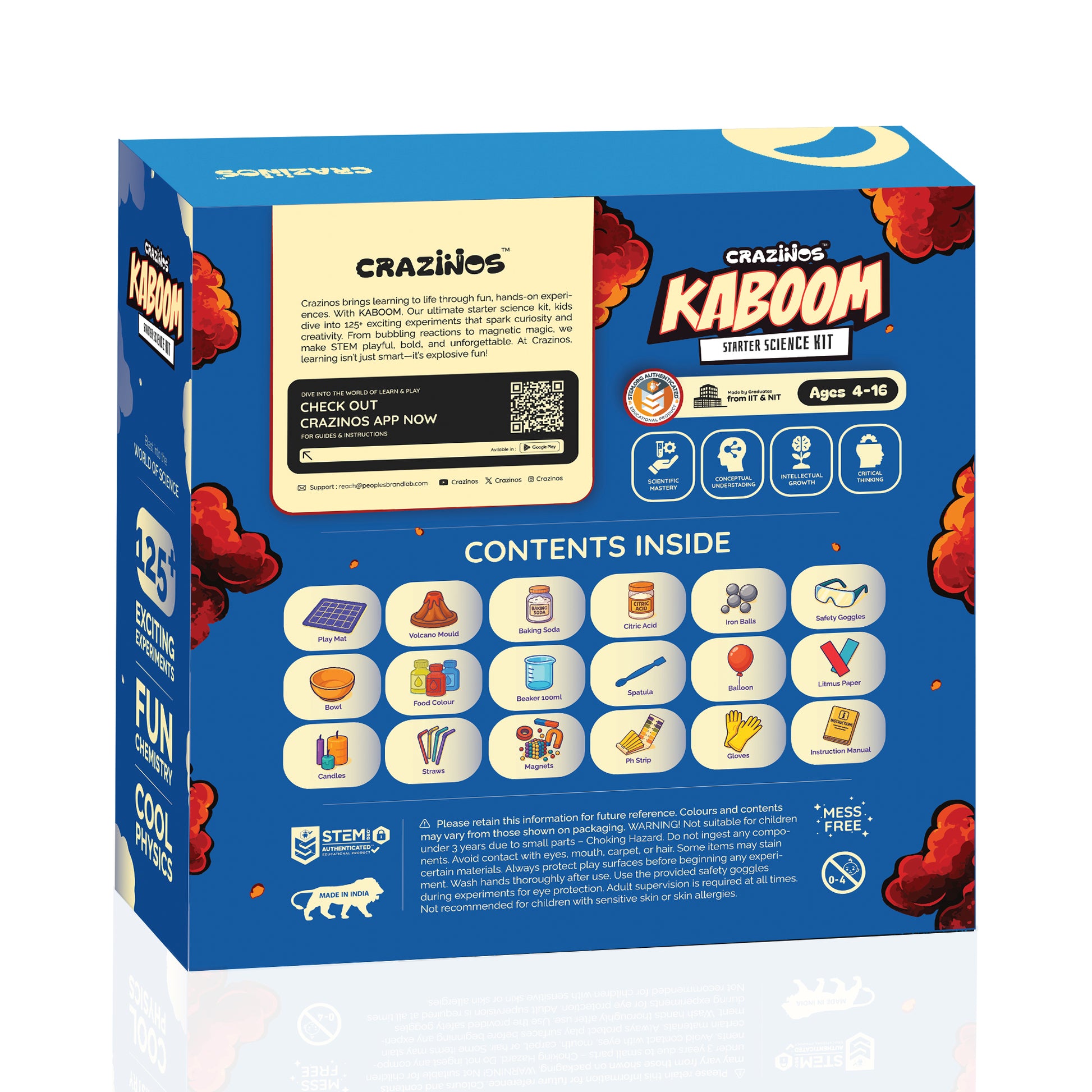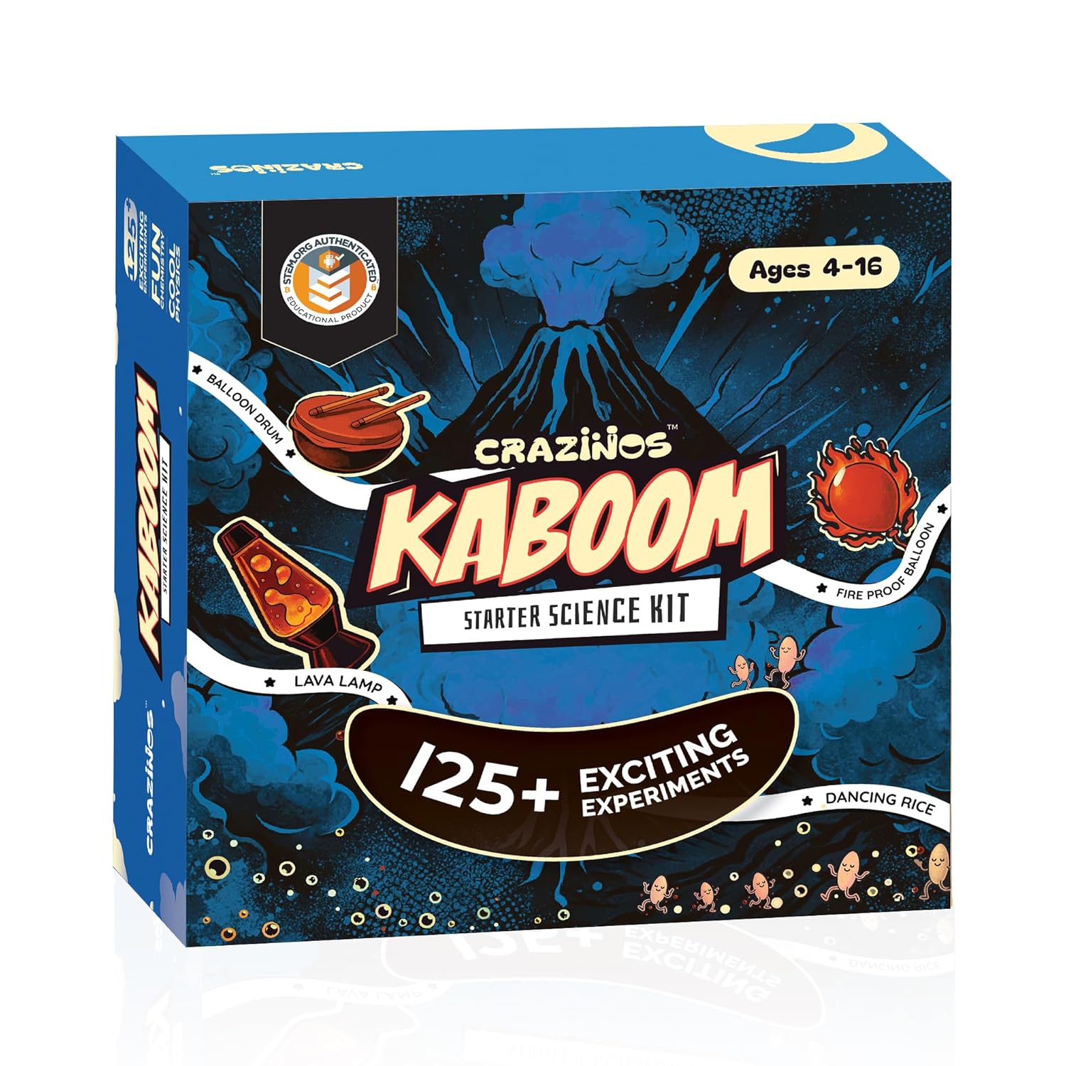 - 🌋 125+ Explosive & Fun Science Experiments The CRAZINOS Kaboom Kit is packed with safe, exciting experiments that fizz, pop, bubble, and erupt! From making a colorful volcano eruption to blowing rainbow bubbles and launching mini rockets, every activity sparks joy and curiosity. Kids feel like real scientists as they mix, stir, and watch reactions happen right before their eyes.