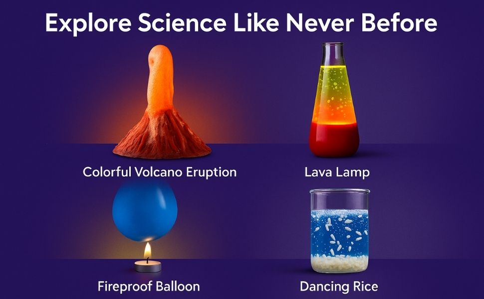 - 📘 Step-by-Step Manual with Science Facts Every activity in the kit is explained in a colorful manual with simple instructions, observations (“Did You See?”), and science explanations (“Why This Happened”). Kids don’t just watch reactions—they understand the science behind it. The manual even includes fun facts to inspire curiosity.